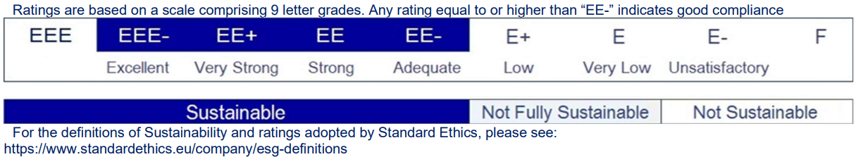 The Standard Ethics Rating is the result of statistical and scientific work carried out since 2004 to provide a snapshot of the economic world in relation to ethical principles promoted by large international organisations. The rating is an opinion on how distant a corporation is from international sustainability guidelines.